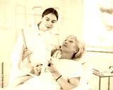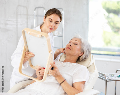 Young brunette cosmetologist consulting old gray haired lady in front of mirror at exam room of aesthetic center.