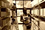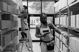 Black employee checking cardboard boxes with goods on shelving units, working with inventory list in a small scale depot. Ensuring small business in house operations, electronic services.