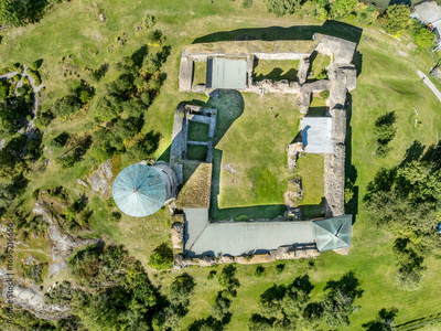 Aerial top down ground plan view of Stegeborg castle in Sweden with round tower and square floor plan