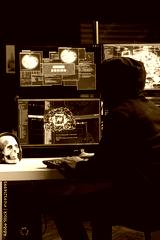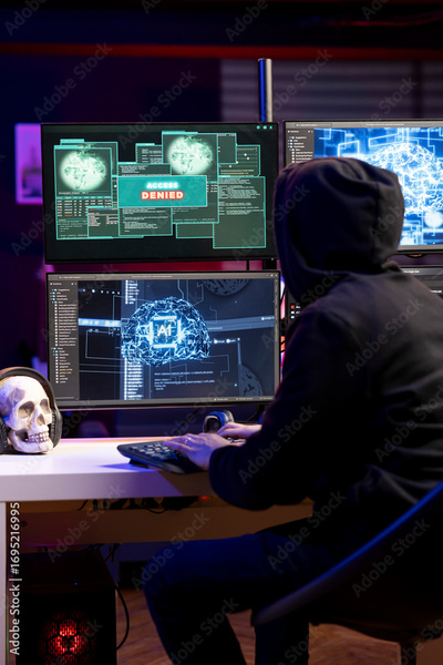 Hacker seeing access denied message on PC monitors while trying to breach company systems. Rogue programmer getting rejected when trying to infiltrate enterprise networks, failing to crack password