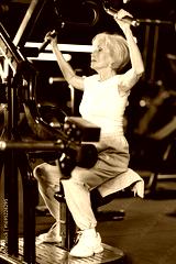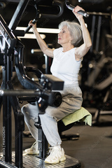 Aspiring older woman training in contemporary fitness center, using lat pulldown machine to strengthen back, arms, and improve upper body posture and muscle control, staying active and healthy
