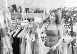 Young woman came to a clothing store in a mall to buy dresses and tops for the summer.