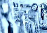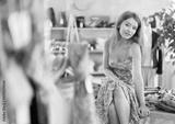 Young woman buyer in summer dress posing sitting on table in clothing store