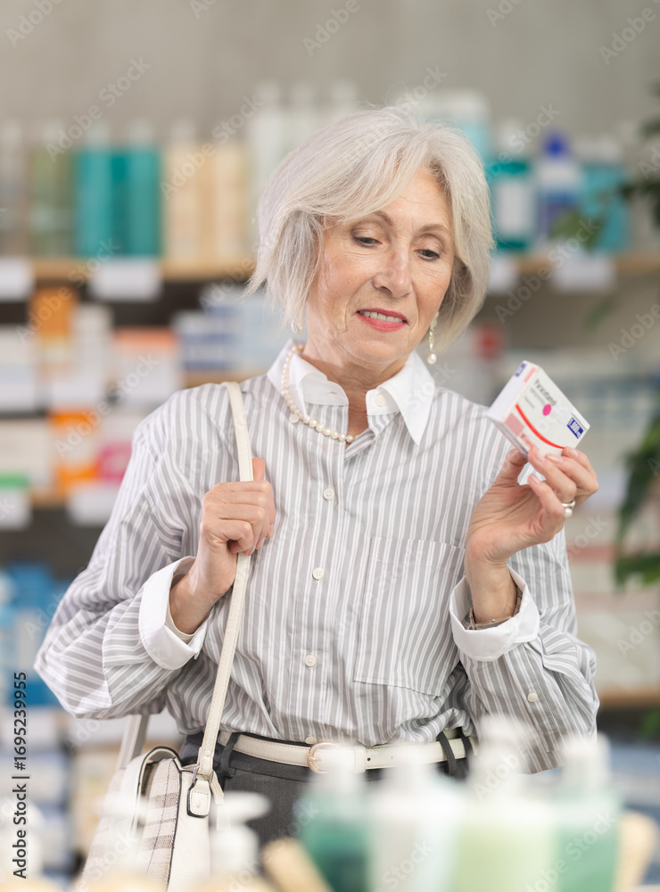 Elderly woman buyer chooses box of paracetamol tablets in pharmacy