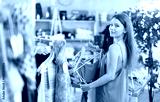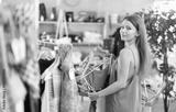 In sales area of store, female customer is choosing summer clothes at womens clothing counter. Buyer examines assortment, makes purchase...