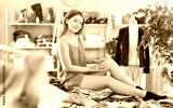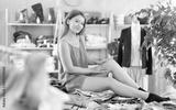 Young woman buyer in summer jumpsuit posing sitting on table in clothing store