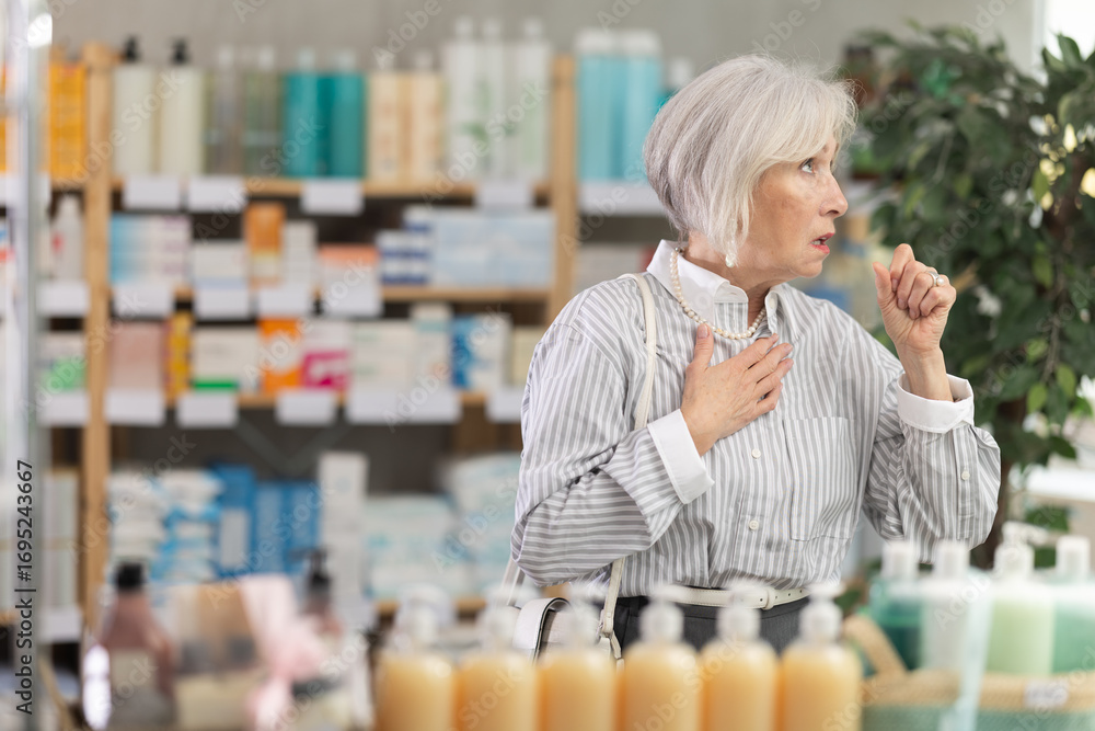 Elderly woman buyer with cough choosing medicines and hygiene products in pharmacy