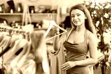Young woman came to a clothing store in a mall to buy dresses and tops for the summer.