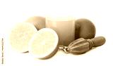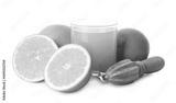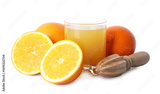 Freshly squeezed orange juice, fruits and juicer isolated on white