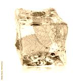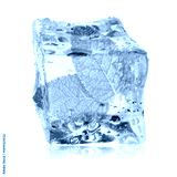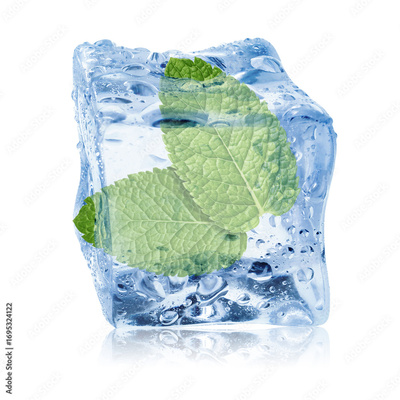 Fresh mint leaves inside clear ice cube on white background