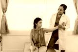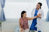 Middle-aged female patient on sofa undergoing physical therapy focusing on muscle strengthening, rehabilitation, and stretching with assistance from Asian nurse.