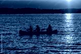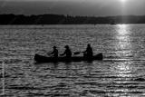 Silhouette of three people kayaking on a lake at sunset in Sweden
