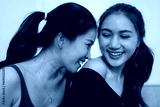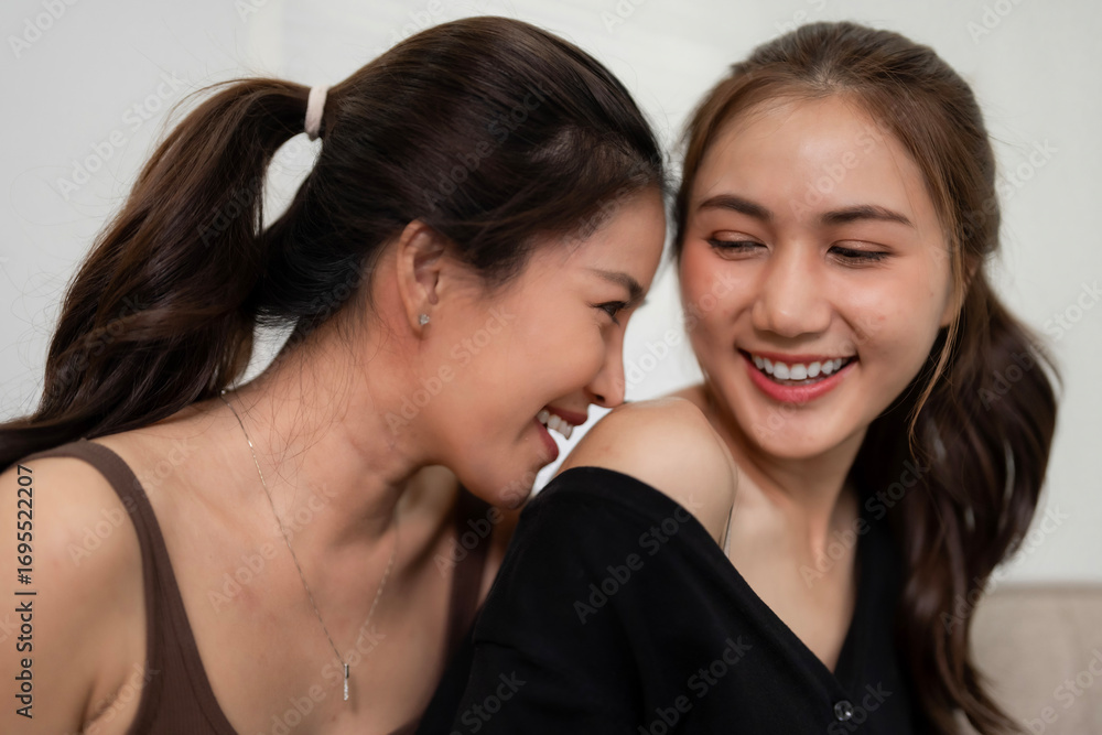 Asian Adult Lesbian Couple Share Genuine Laughter Intimate Playful Connection Authentic Joyful Moment Together at Home