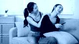 Asian lesbian couple share happy relaxing moments at home woman massages partner shoulder enjoy laughter smartphone fun comfort lifestyle