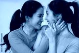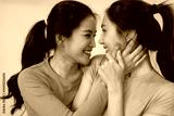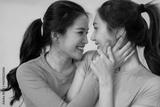 Asian lesbian couple young adult women share affectionate moment gazing lovingly expressing intimate bond happiness tender embrace diverse love celebrate modern relationship connection