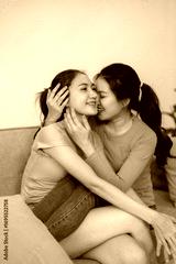 Asian young adult lesbian couple share intimate affection embrace tenderly cozy sofa home show love connection domestic life happiness