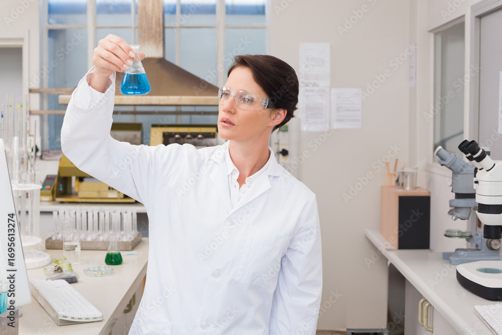 Female scientist holding up conical flask in lab inspecting blue solution wearing goggles