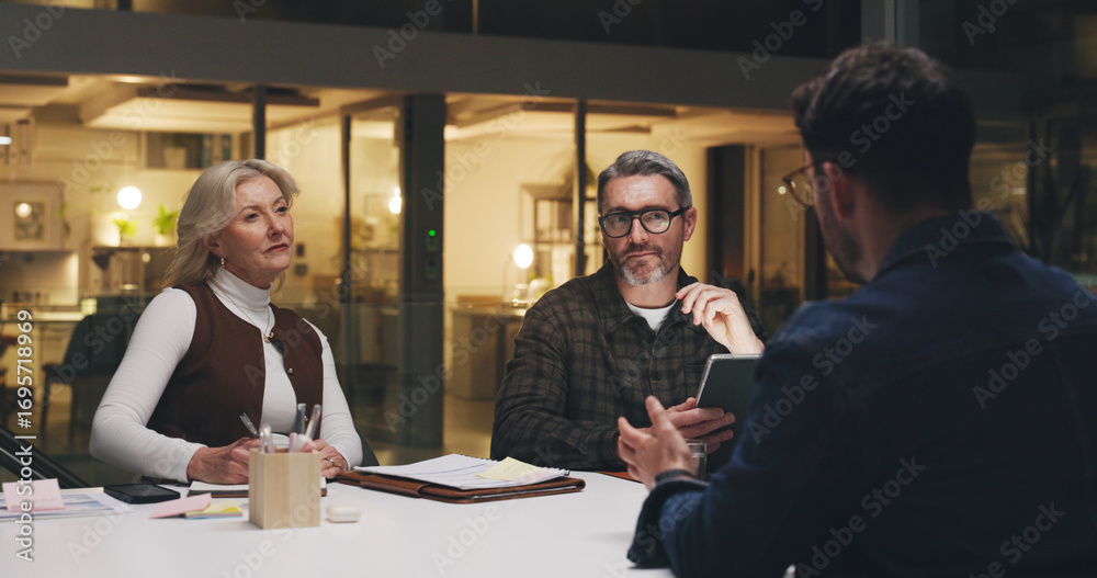 Business, team and listening in meeting at night for editorial planning, story ideas or feedback. Publishing agency, people and editor with discussion for article guidance, topics review and deadline