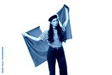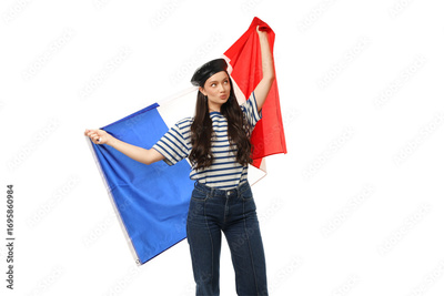 Girl in stripes and beret with flags, isolated on white, PNG