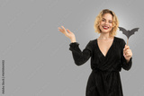 Woman in black holds bat at Halloween party