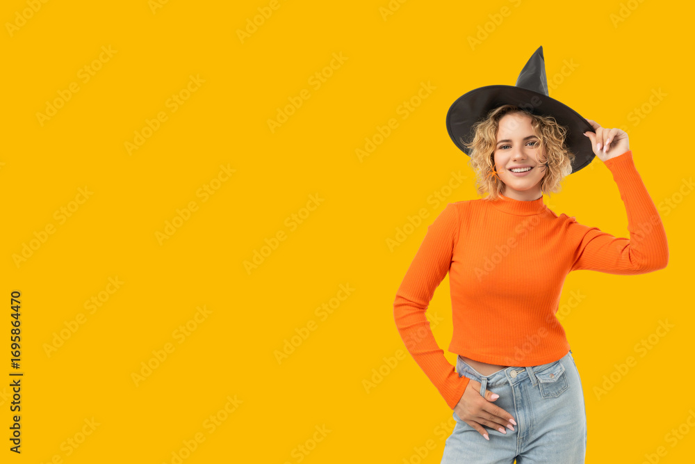 Cheerful woman in orange sweater and witch hat enjoying Halloween