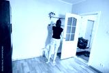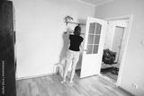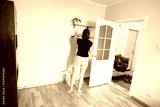 Woman in yellow gloves cleaning dusty shelves in a cozy home interior. Domestic chores, spring cleaning, or preparing for moving. Home maintenance and everyday life concept.