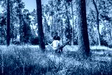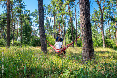 Couple relaxing in a colorful hammock amidst tall pine trees in a sun-drenched forest. Perfect for themes of outdoor leisure, summer holidays, and nature escapes.