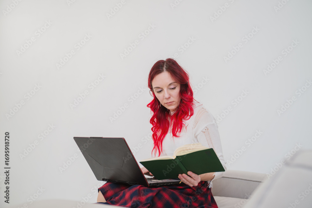A focused red-haired woman studies intently, balancing a laptop and an open book, symbolizing modern learning, remote work, or creative study against a clean white background.