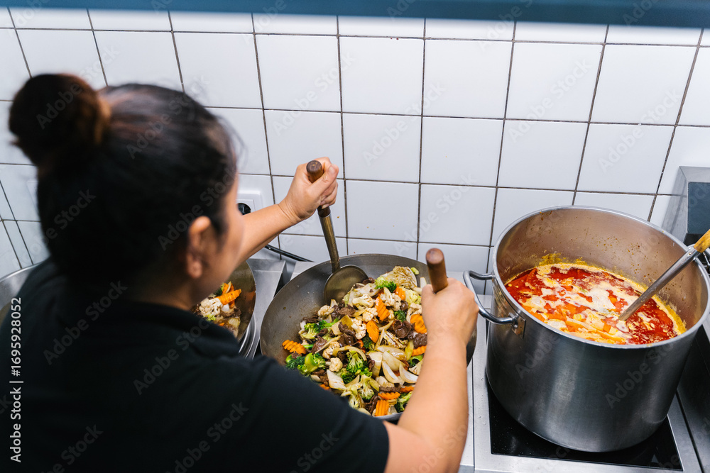 Chef cooking stir-fried vegetables and beef in a wok on a professional kitchen stove. Top-down view of Thai or Asian cuisine in preparation.