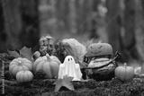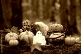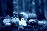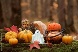 ghost figurine and witch cauldron with decorative halloween pumpkins in autumnal forest, nature backdrop. Halloween background. Magic, witchcraft, mystery fairy tale atmosphere. Fall season decor