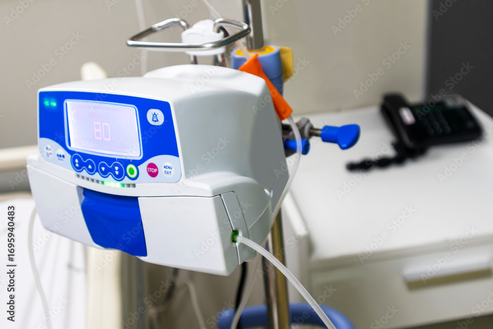Infusion Pump for medical use in hospital wards. It automatically controls the volume and flow rate of solution into the veins.