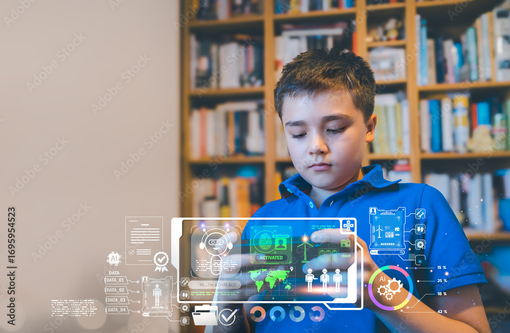 Boy using smartphone with futuristic AI,digital interface of humanity,technology,environment in library with digital tool.Concept Education future learning,Renewable energy for school project STEM