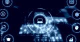 Displaying central laptop icon within grid at virtual interface, with binary streams and tech icons