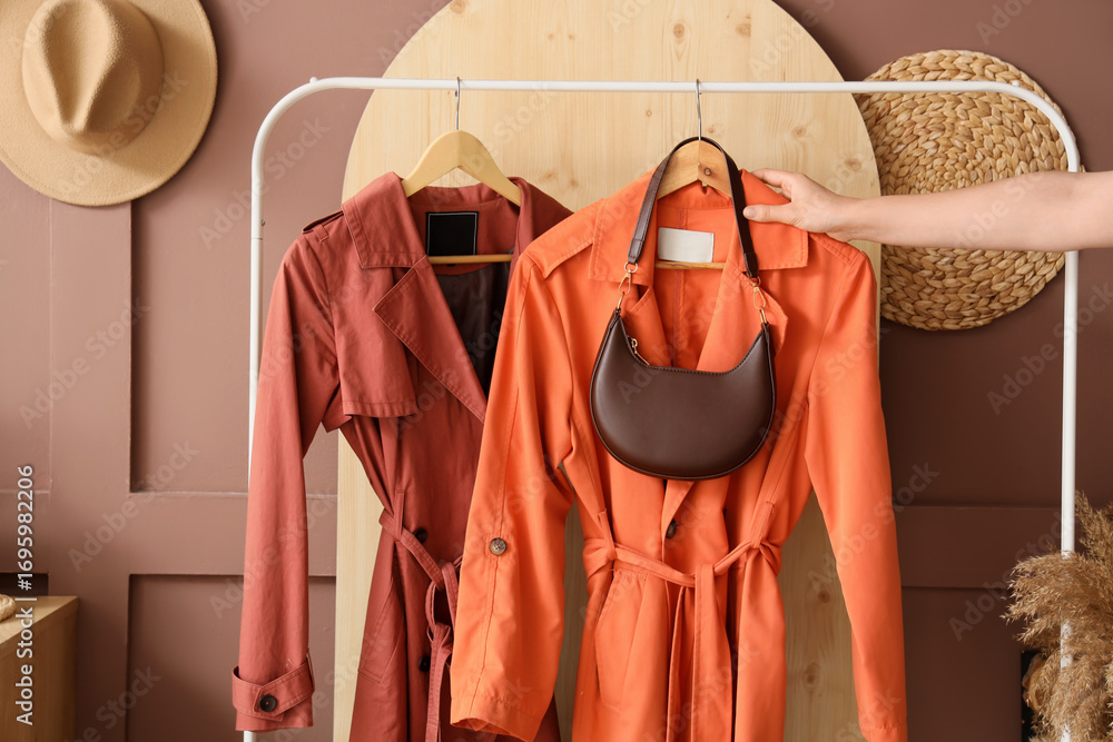 Female hand and rack with stylish trench coats in hallway