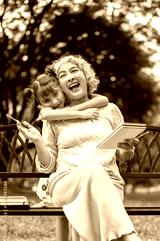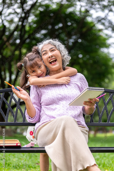 Kid girl granddaughter standing shoulder hugging old woman grandmother who sitting on bench in park.