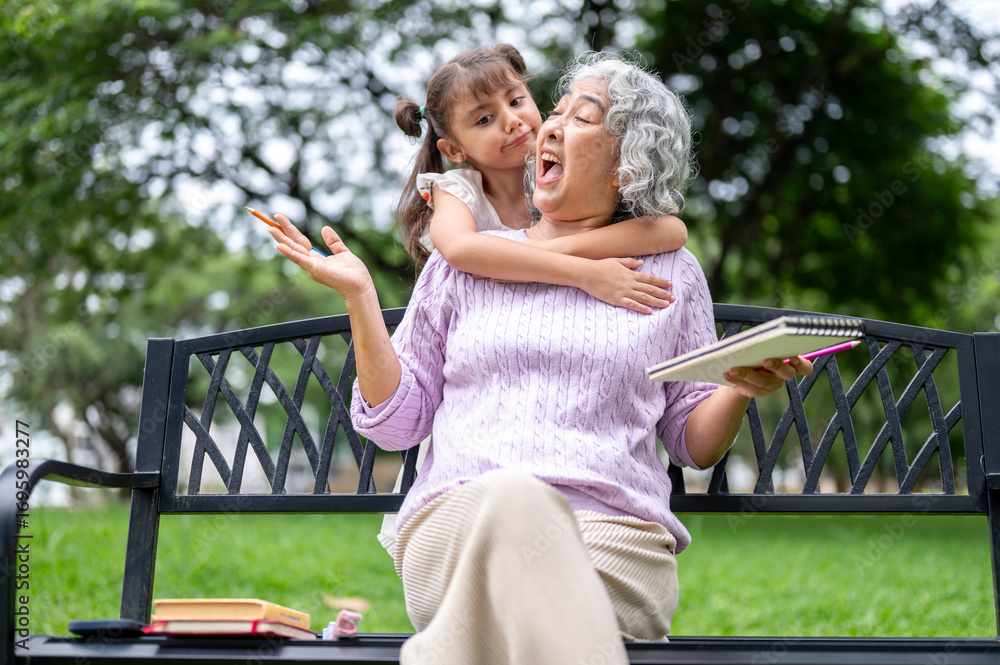 Old woman grandmother making funny face as getting hugged by kid girl granddaughter on bench in park