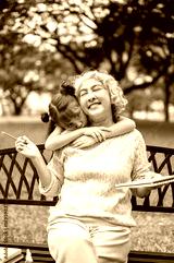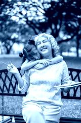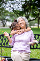 Old woman grandmother enjoy getting hugged by kid girl granddaughter while sitting on bench in park.
