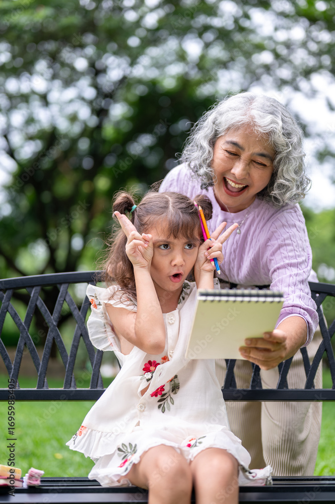 Kid girl granddaughter making funny face imitating a drawing in notebook holding by old woman granny