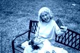 Old woman grandma taking picture on phone with kid girl granddaughter laying on lap at park's bench.