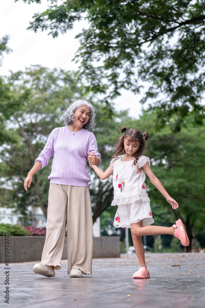 Old woman grandmother holding hand with a kid girl granddaughter while walking on pavement in park.