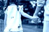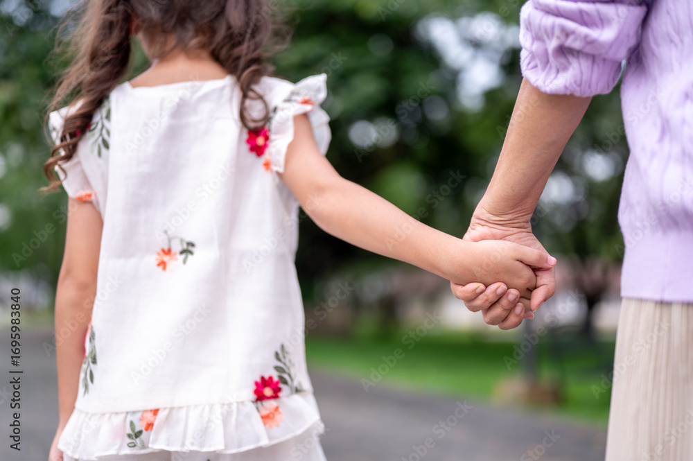 Back view old woman grandmother holding hand walking with kid girl granddaughter on sidewalk in park