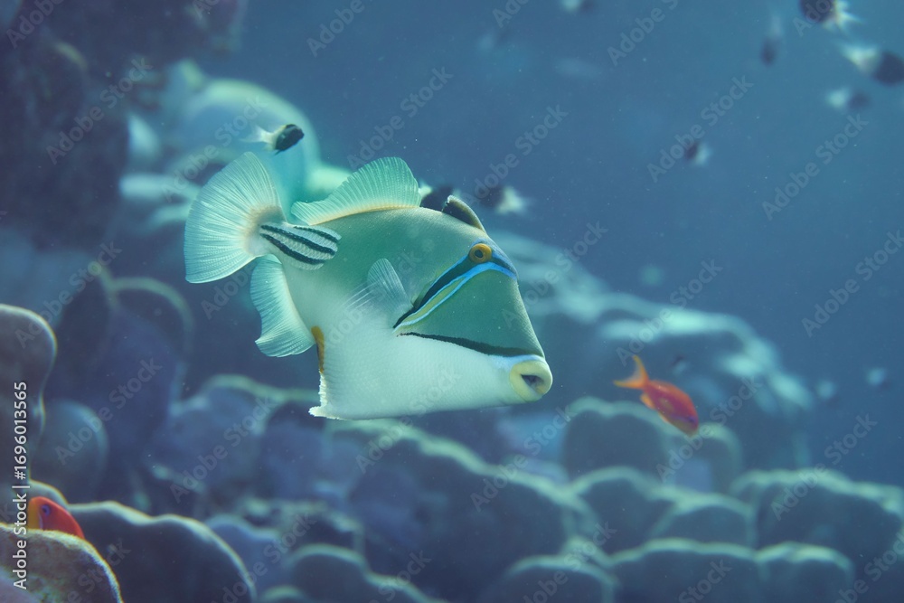 A colorful picasso triggerfish swimming gracefully in a vibrant coral reef.