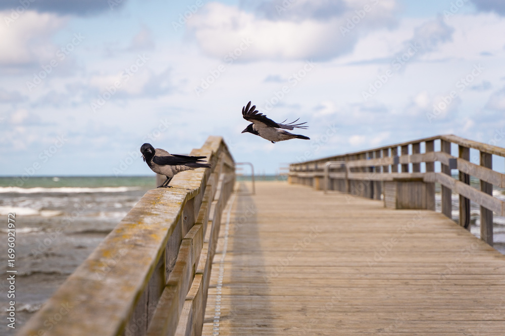 A Serene Shoreline Area with Birds Gracefully Flying Over a Beautiful Wooden Pier