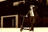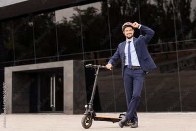 Handsome young businessman in helmet on electric scooter near office building