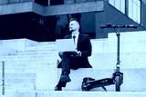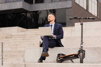 Handsome young businessman with laptop and electric scooter sitting on stairs near office building