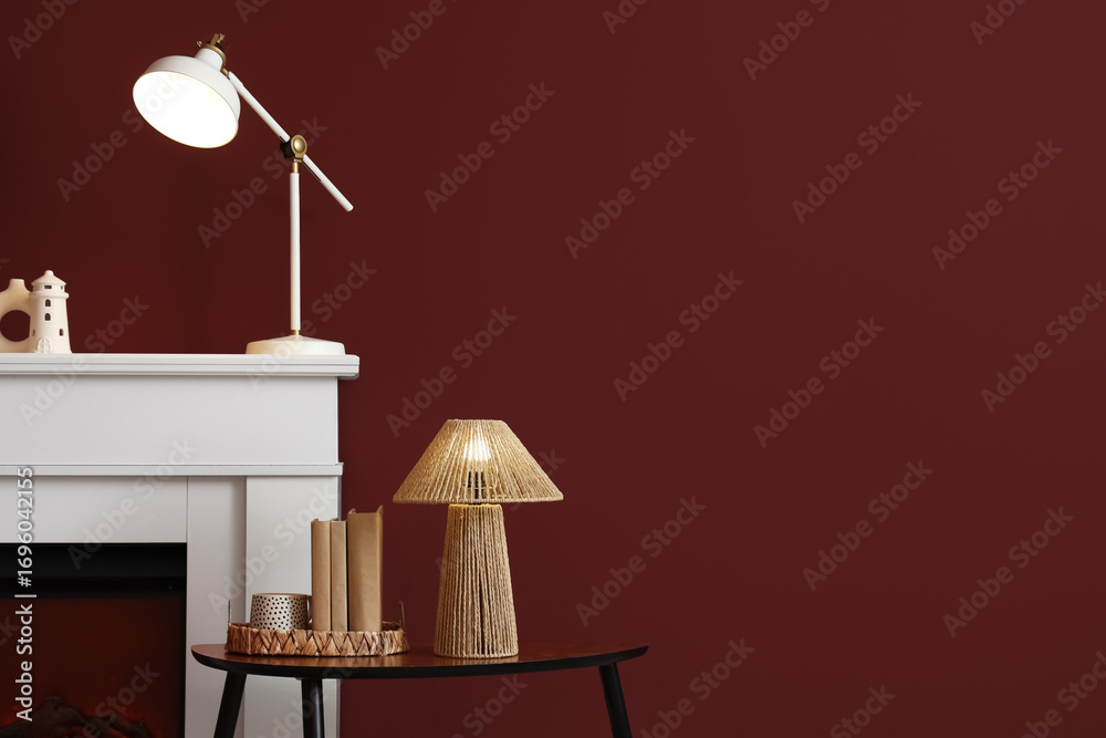Interior of stylish room with fireplace, coffee table and glowing lamp near red wall