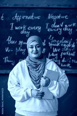 Portrait of young adult Middle Eastern woman wearing hijab looking into camera, holding notebook standing in front of chalkboard with English grammar sentences in language school classroom