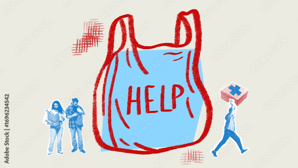 Surreal collage art. Giant plastic bag with help message surrounded by people and aid symbols. Concept of humanitarian need, ecological crisis, support systems, and symbolic consumer culture critique.