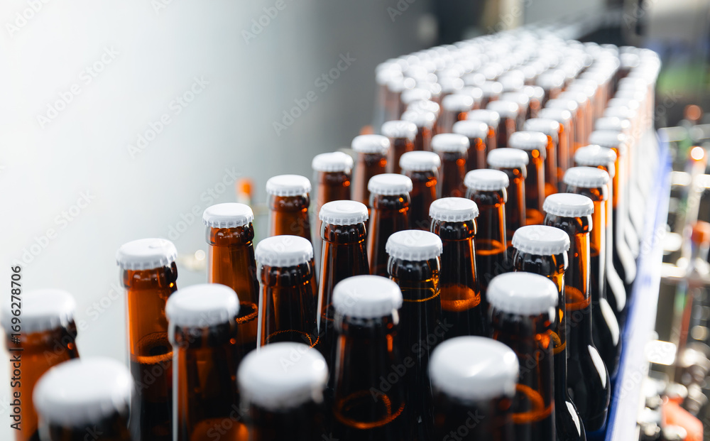 Beer bottling line in brewery: rows of amber glass bottles with caps