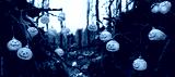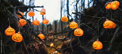 jack-o' lantern pumpkins garland in forest, dark abstract natural background. symbol of Halloween, Samhain holidays. autumn season. fairy tale, Mystery Witchcraft, magic aesthetic